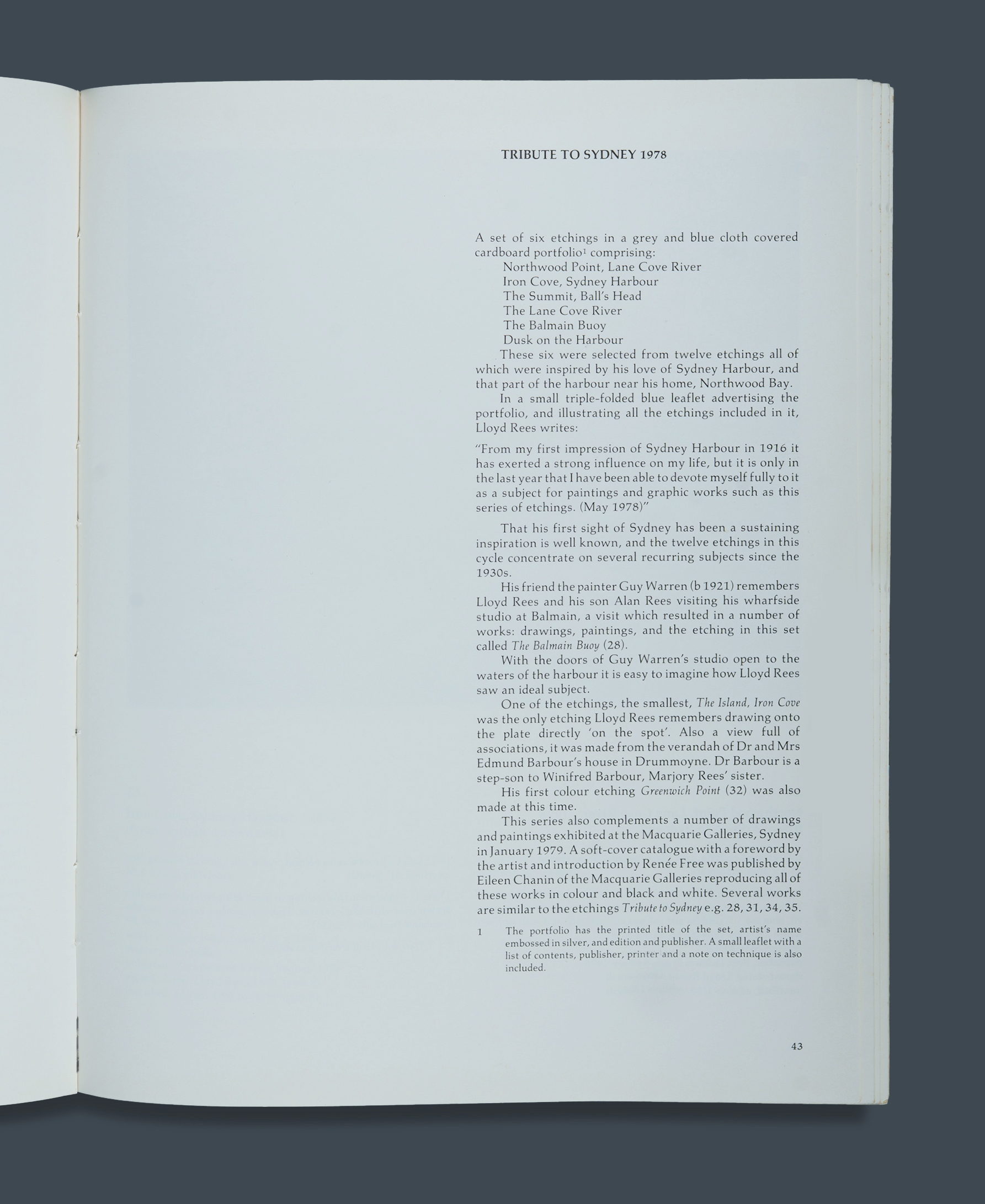 REES, Lloyd (1895-1988) (4) Four etchings from the 'Tribute to Sydney' series, 1978: 'Iron Cove, Sydney Harbour', 'The Summit, Ball's Head', 'The Lane Cove River', and 'The Balmain Buoy' All signed lower right, and hinged into archival window mounts, with The Art Gallery of Western Australia inward loan label verso. Soft-Ground Etching (4) 8/90 25x30cm (plate) 55x47.5cm (mount)