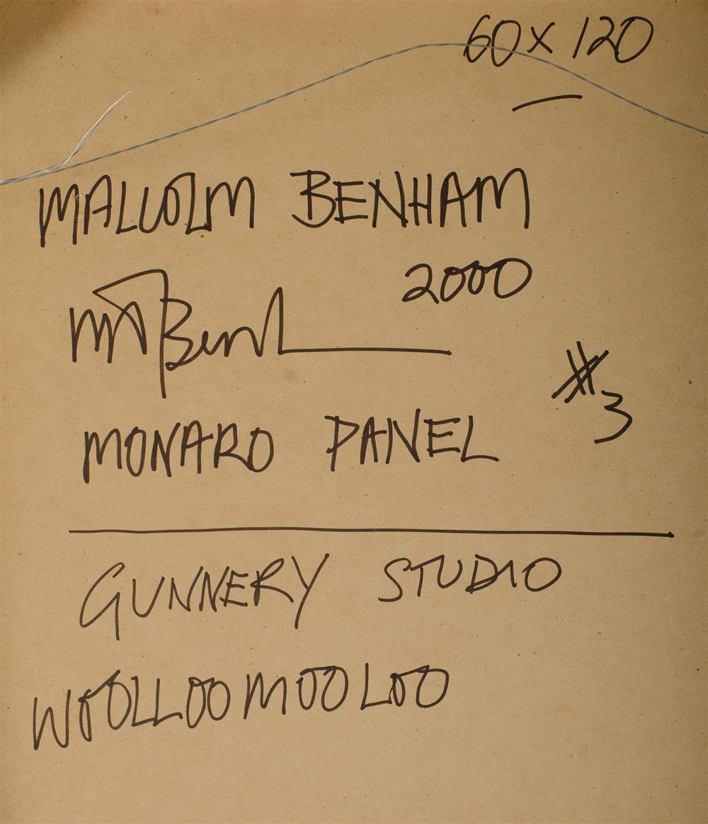 BENHAM, Malcolm (New Zealand b.1949) (3) Monaro Panels - numbers 1, 3 and 10, 2000. Each signed & inscribed verso. Mixed Media on Board (3) 120x60cm (each) Estimate $400-700