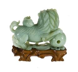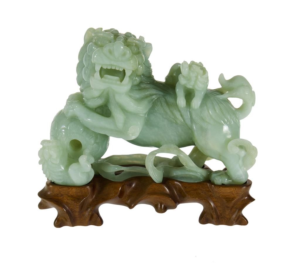 Chinese Jade Guardian Lion and Cubs. Well carved guardian lion with ball & two playful cubs, on a fitted wooden base. H12cm (figure only) Estimate $300-500