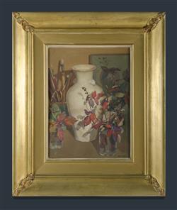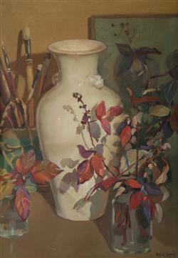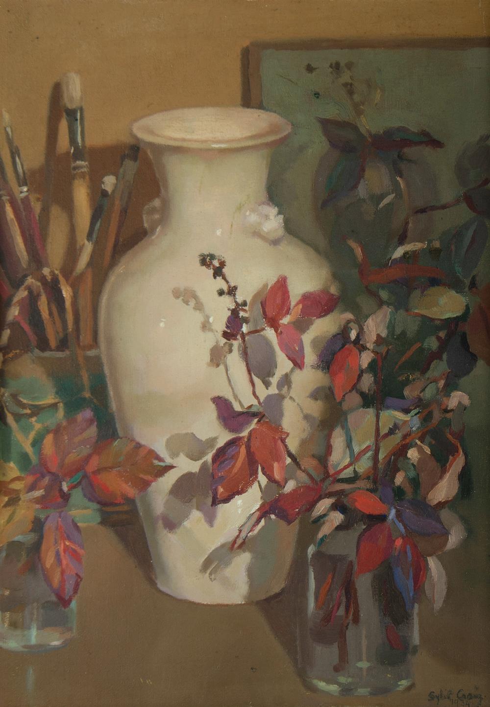 CRAIG, Sybil (1901-1989) 'Chinese Jar and Black-Berry Leaves,' 1934. Label verso for Gowrie Galleries. Provenance: Angeloro family collection. Oil on Canvas Board 37x27cm Estimate $800-1,200