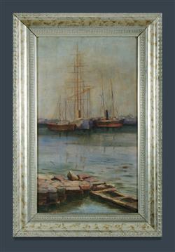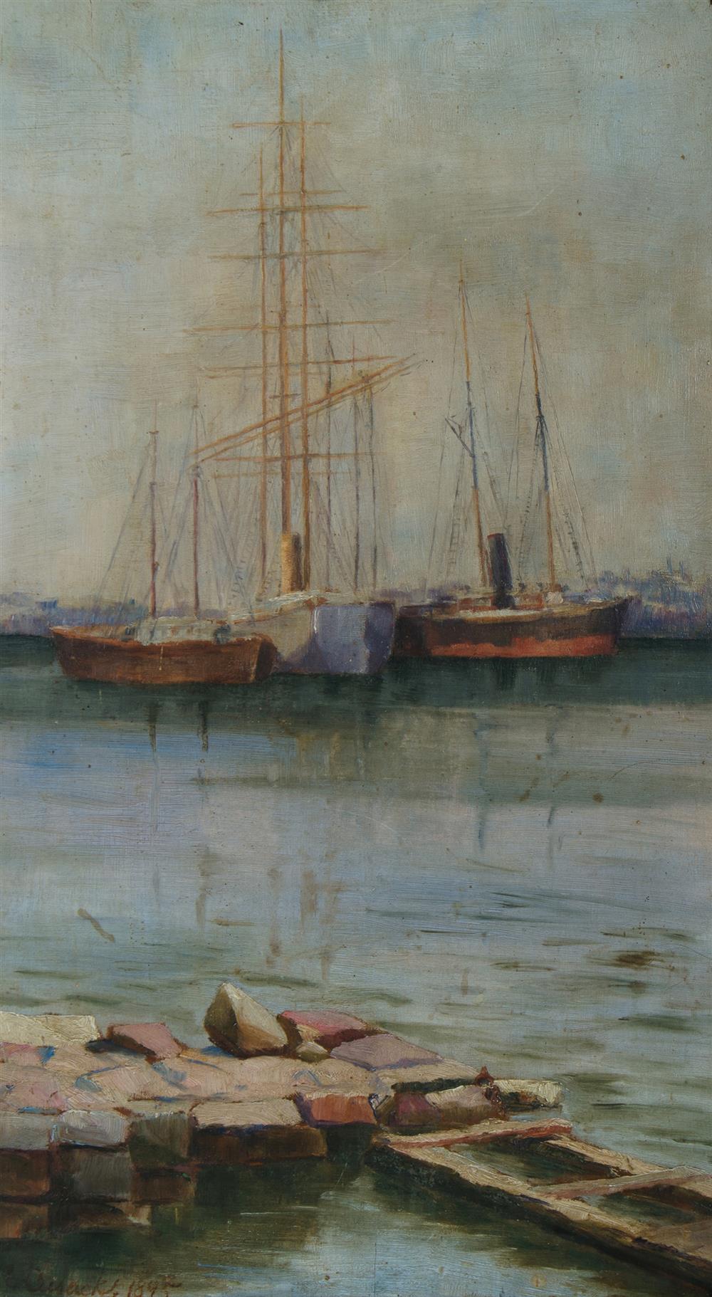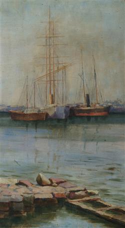 CUSACK, Aline (1867-1949) Moored Ships, Darling Harbour, 1895 Provenance: Angeloro family collection. Oil on Panel 41.5x24cm Estimate $500-800