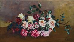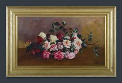 MESTON, Emily (c1864-1914) Roses, 1893 Exhibited Royal Art Society NSW 1893. Provenance: Angeloro family collection. Oil on Canvas 32x57cm Estimate $500-800