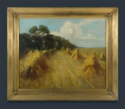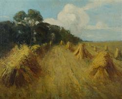 Attrib TUOMY, Fabiola (1875-1967) Haystacks, possibly at Charterisville. Fabiola Tuomy was a student of Phillips Fox & Tudor St. G Tucker's Summer Art School at Charterisville. Purchased as a work by the artist at Leonard Joel, Melbourne 23rd Aug 1995 (lot 965). Provenance: Angeloro family collection. Oil on Canvas 59.5x74cm Estimate $800-1,500
