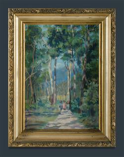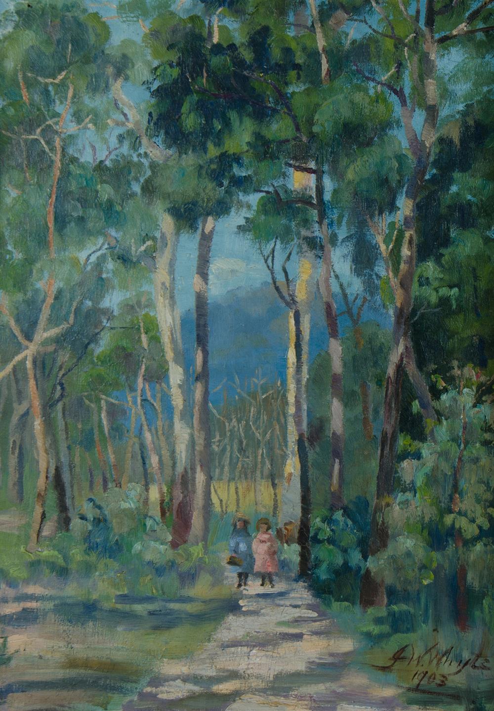 WHYTE, Janie Wilkinson (1869-1953) Children on a Bush Path, 1903 Provenance: Angeloro family collection. Oil on Board 34x24cm Estimate $250-450