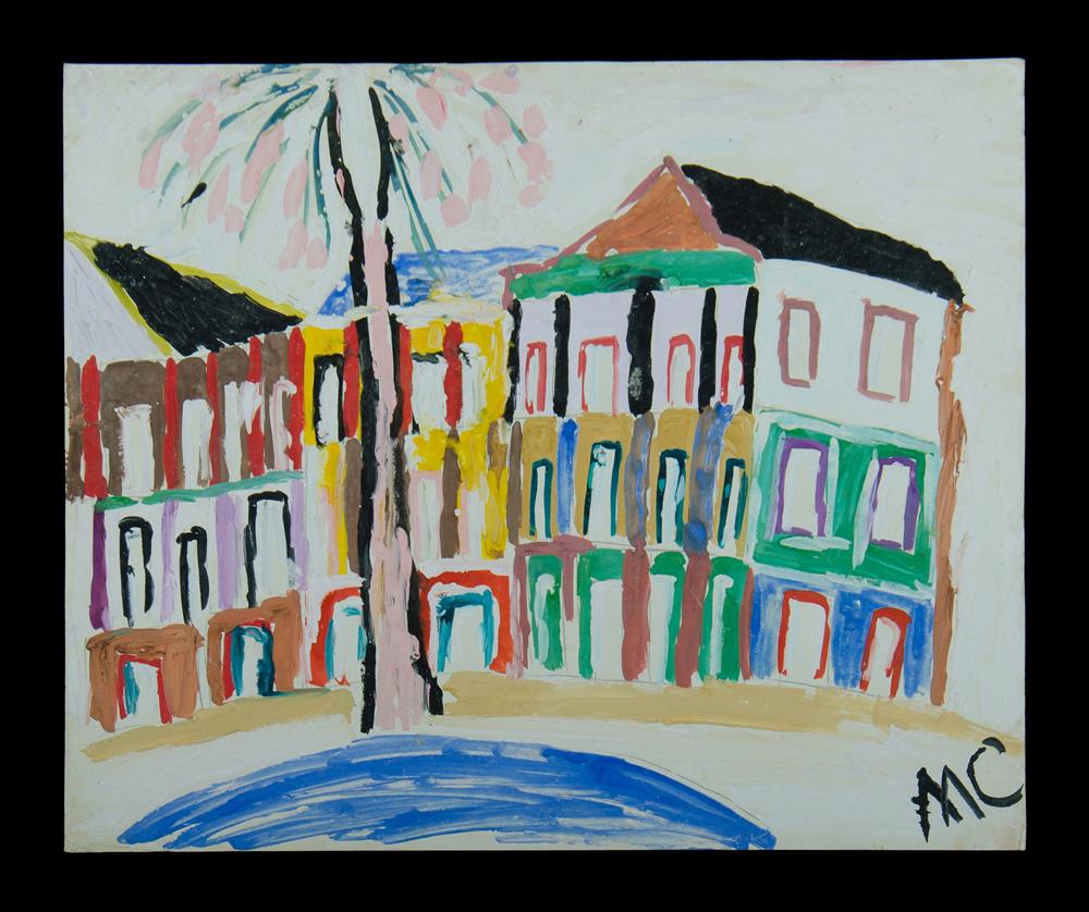DE CHAZAL, Malcolm (Mauritius 1902-1981) Untitled (Resort & Palm) Provenance: gift from the artist to current owner's late husband; private collection, ACT. Accompanied by signed letter of provenance. Gouache 52x63.5cm Estimate $800-1,500