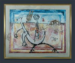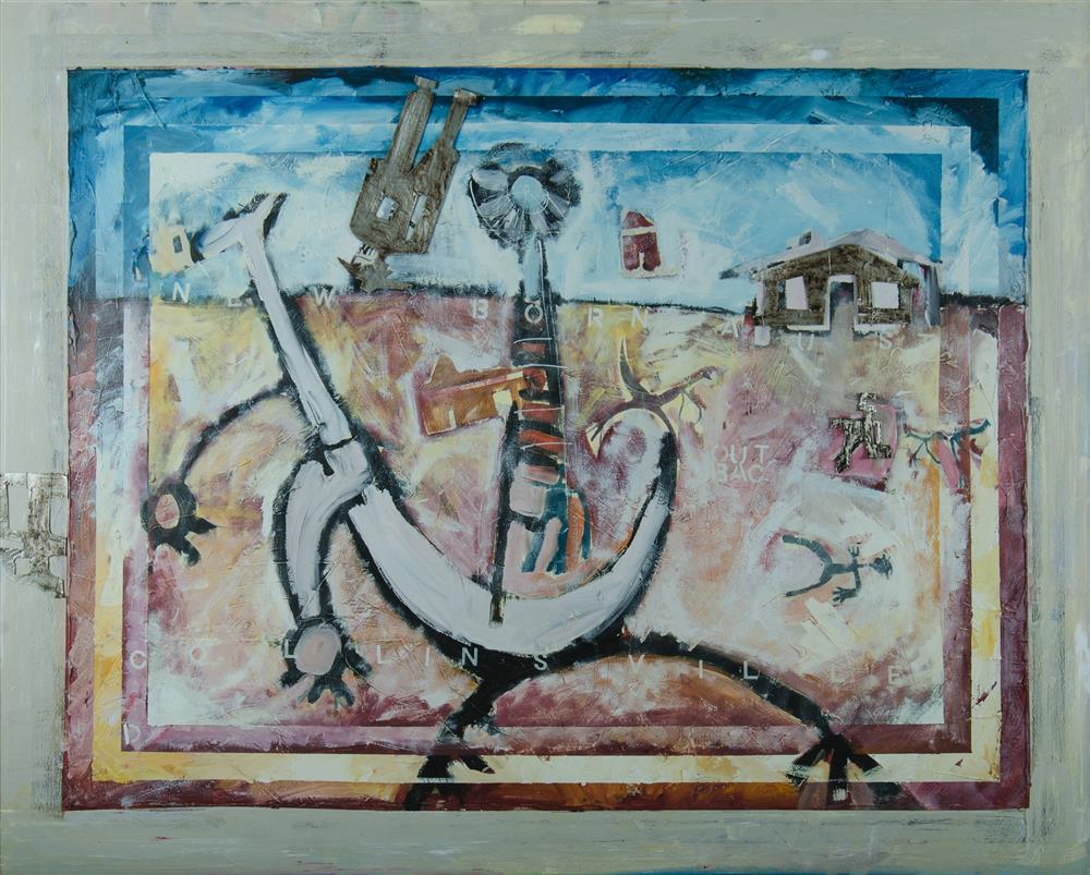 GLASKIN, Derek (b.1957) 'The New Born - Australia Collinsville Stud, 1990. Provenance: The Verlie Just Collection. Acrylic & Collage on Canvas 120x151cm Estimate $200-400