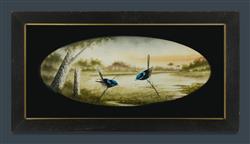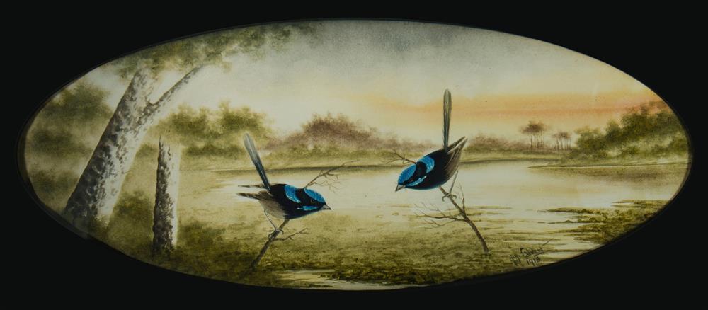 CALVERT, Herbert Hepburn (1870-1923) Pair of Blue Wrens in a River Landscape, 1918. W/Clr 23x57cm (oval) Estimate $300-500
