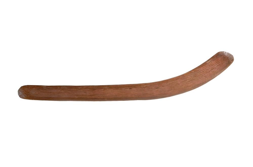 Early 20th C Western Desert Boomerang. Club form with fine linear grooves & chamfered edges. Ochre traces. (L71cm) Estimate $200-350