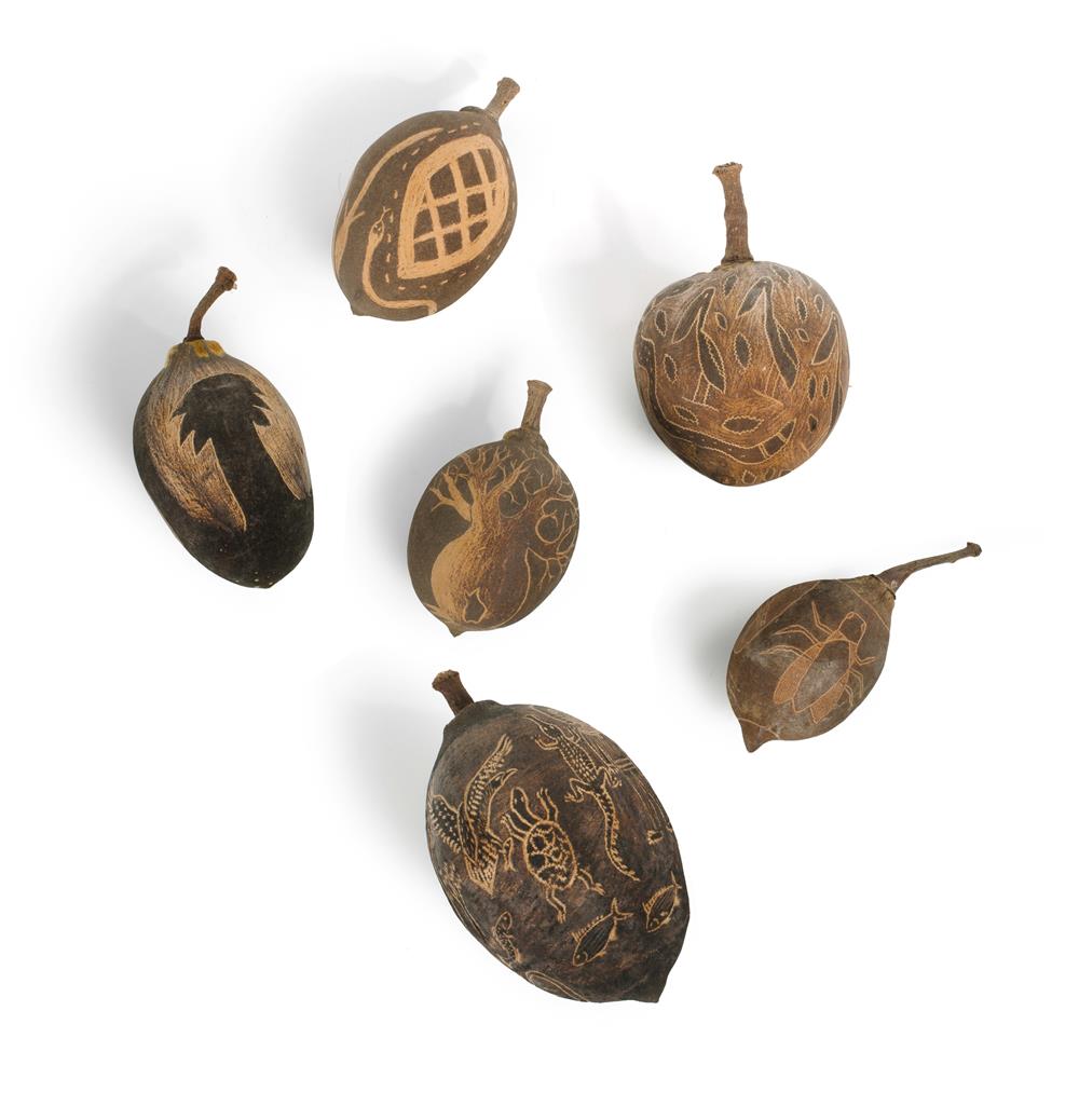 6 Aboriginal Carved Boab Nuts. Incl. a Kimberley work of many fauna & a Wandjina. (H18cm) Estimate $50-100