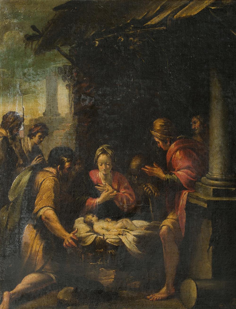 Attrib. STROZZI, Bernardo (Italian 1581-1644) Adoration of the Shepherds Inventory making the attribution under the name of Dr Gustav Frizzoni, dated 16th Jan. 1906. Document states: 'Anbetung der Hirten: hübsche Werk von dem tuchtigen Genueser Bernardo Strozzi, XVII Jahrhundert [Adoration of the Shepherds: beautiful work by the cloth-covered Genoese Bernardo Strozzi, XVII century]' Oil on Canvas 61.5x49.5cm