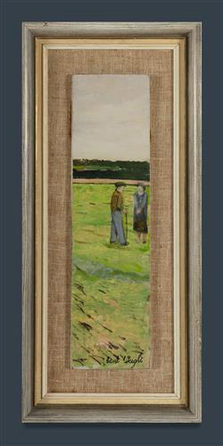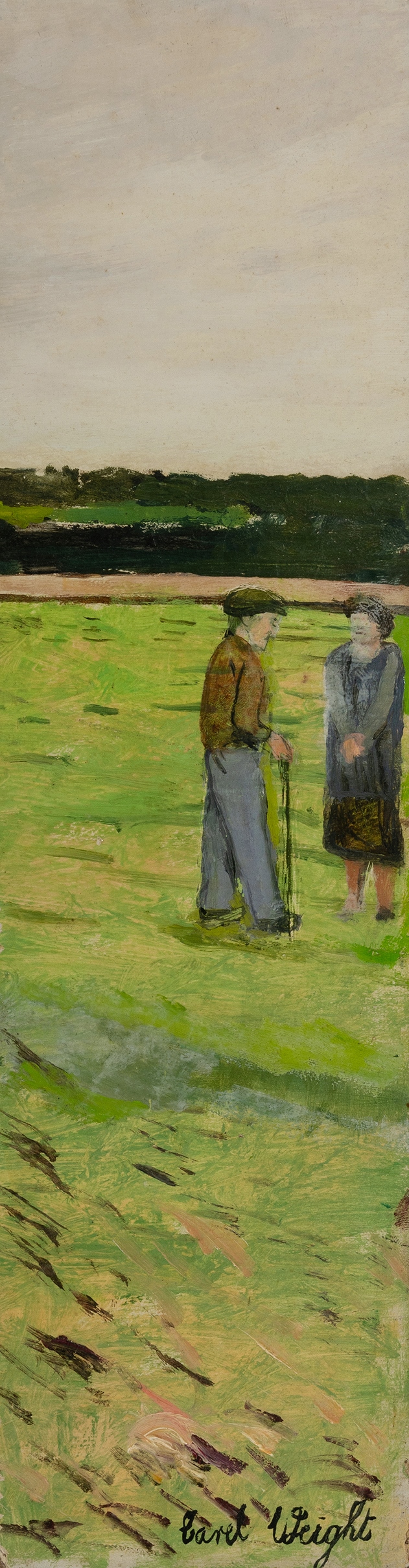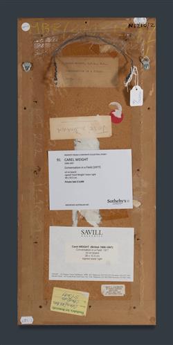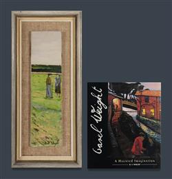 WEIGHT, Carel (British 1908-1997) 'Conversation in a Field,' 1977. Artist label verso. Accompanied by book 'Carel Weight - A Haunted Imagination' by R,V, Weight, David & Charles, UK, 1994. Oil on Board 38x10cm
