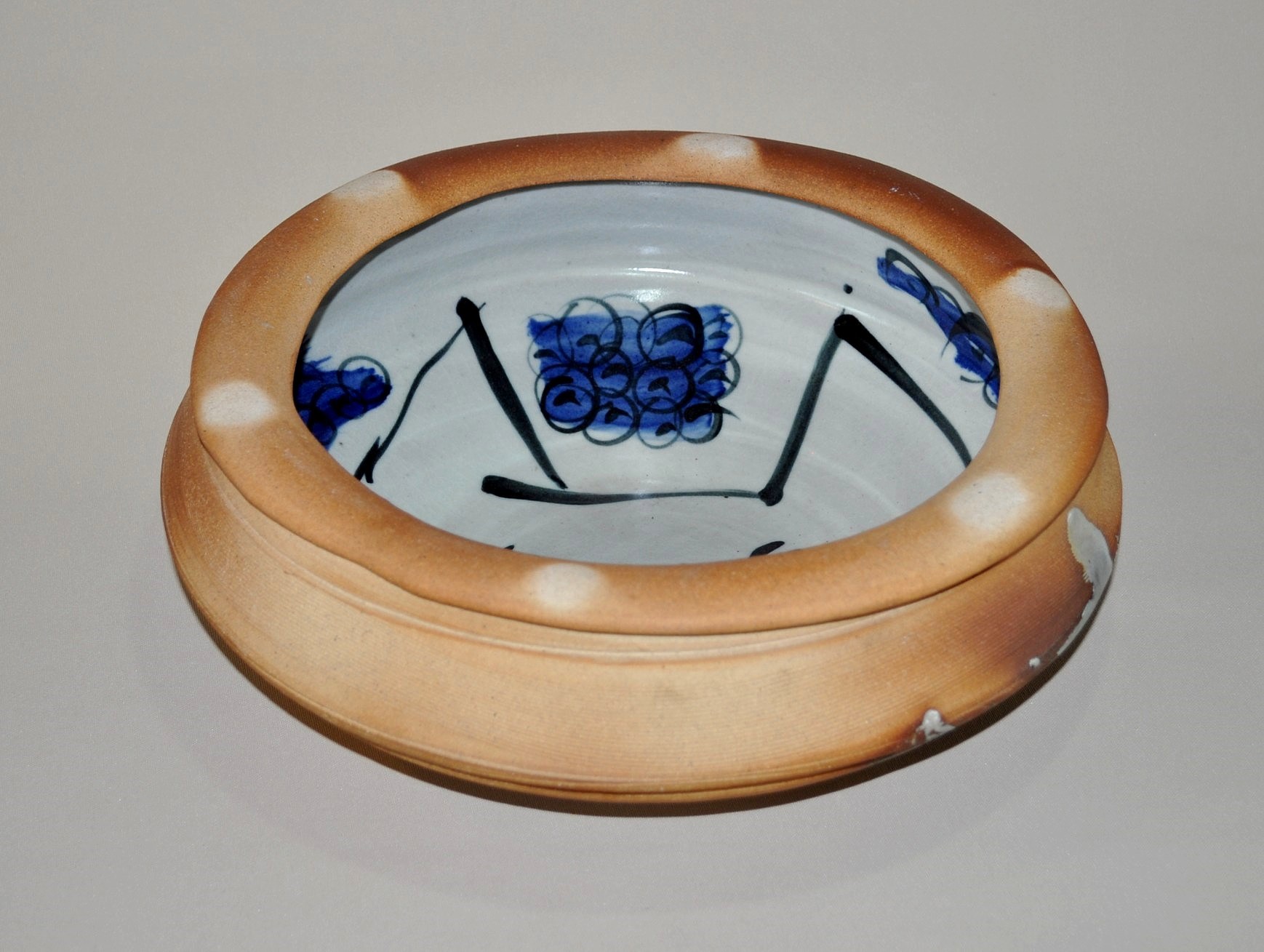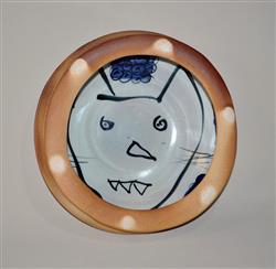 Potter Unknown, Large Coarse Stoneware Rimmed Bowl. Bizen type firing, combed pattern to outer rim, magnesium glaze interior with brushed cobalt fruit, & brushed iron black whimsical cat's face. Potter's seal to base. (Dia 38cm)Estimate $300-400