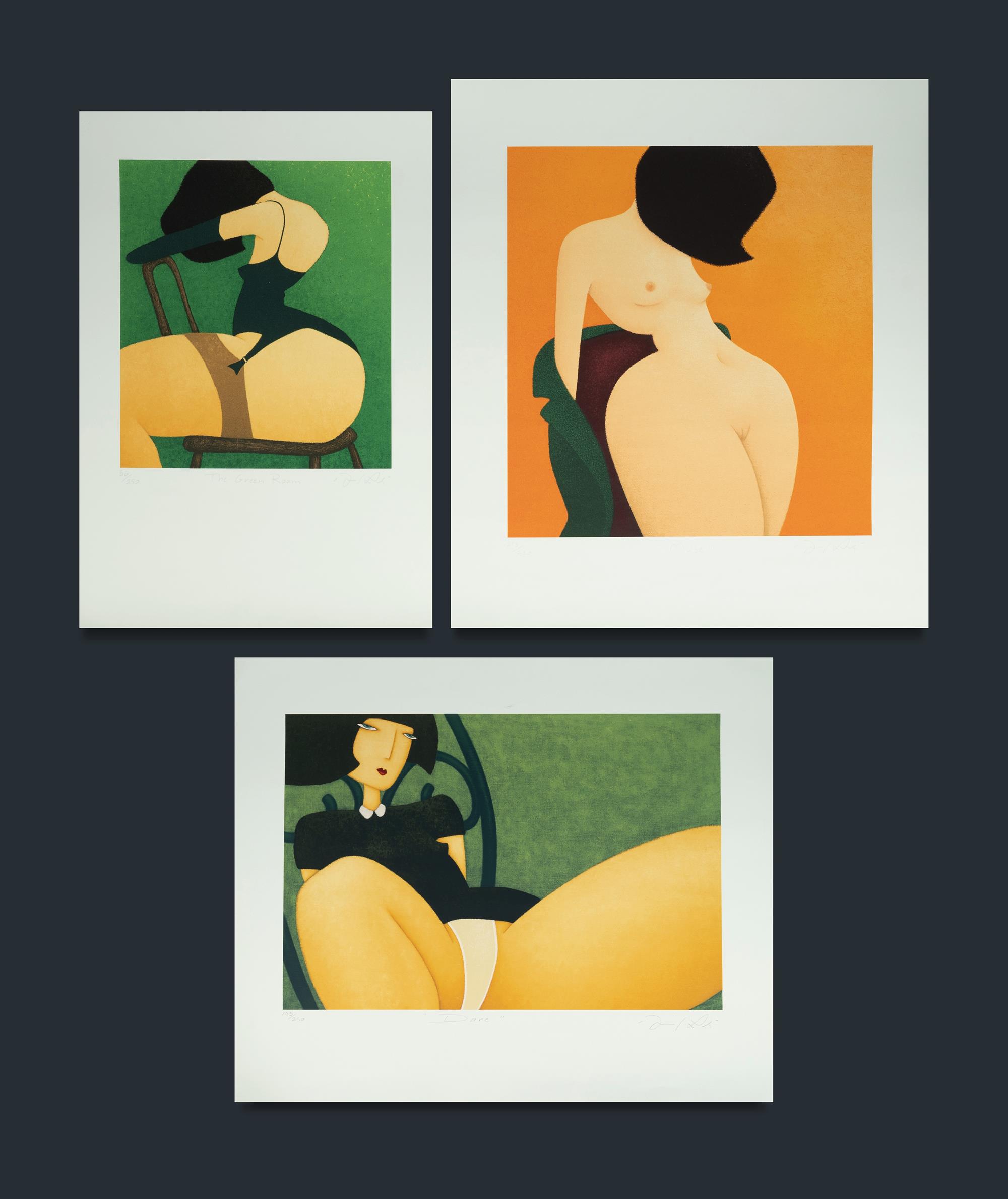 LAITY, David (b.1958) 'The Green Room' (44x42cm), 56/250; 'Dare' (44x68cm), 195/250; & 'Muse' (57x57cm), 213/250. S/Print (3)Estimate $250-450