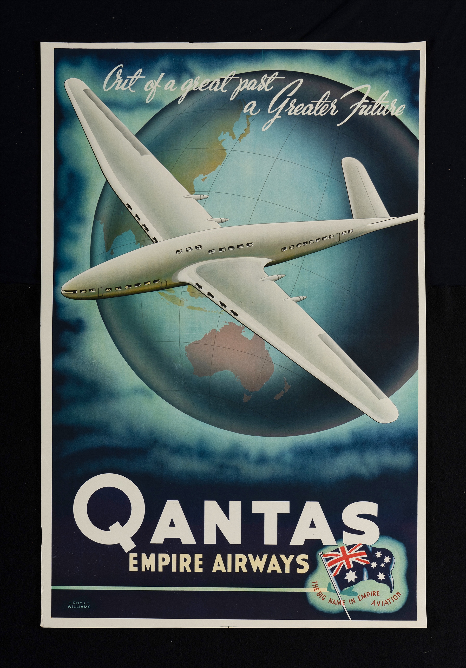 WILLIAMS Rhys (1894-1976), 'Out of a Great Past a Greater Future.' An advertising poster for Qantas Empire Airways designed by leading Australian commercial artist Rhys Williams c.1938. The poster depicts a plane set against a globe, with Australia clearly visible at the bottom. The poster emphasises Qantas's past, arguing 'out of a great past a greater future.' Offset Lithograph on Paper (100.5x66cm) (overall)