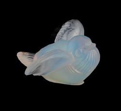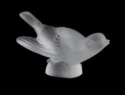 Pr Lalique Moulded Glass Birds 'Moineau Coquet' & 'Moineau Moqueur.' Together with a Sabino moulded glass sparrow. L13.5cm (longest) Provenance: Deceased Estate, Sydney.Estimate $200-400