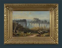 GERRARD, Charles Frederick (1849-1904) Blue Mountains Escarpment, NSW, 1889. Oil on Board 30x44cm PROVENANCE: Private collection, Sydney.Estimate $800-1,500
