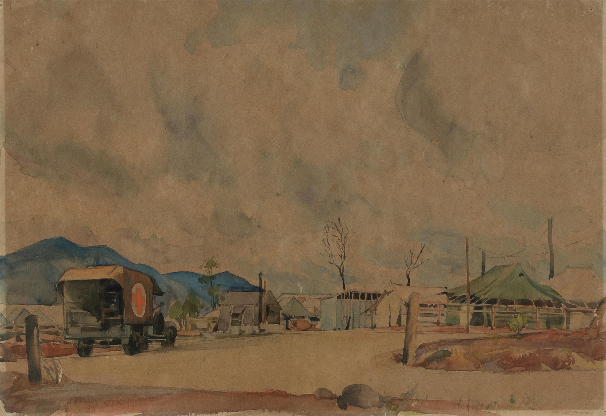 Artist Unknown, WWII Military Camp with Red Cross Truck W/Clr 25x36cm PROVENANCE: A private collection, Sydney.Estimate $200-300