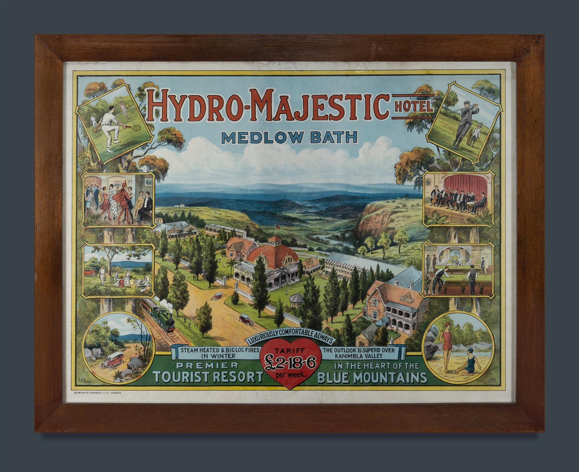 HUNT, Charles Henry (1857-1938) 'Hydro-Majestic Hotel, Medlow Bath,' c.1920s. Original vintage lithographic poster pub. Bloxham & Chambers Ltd, Sydney. Lithograph 75x99.5cm (sight) (lobby)Estimate $1,000-2,000