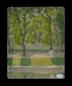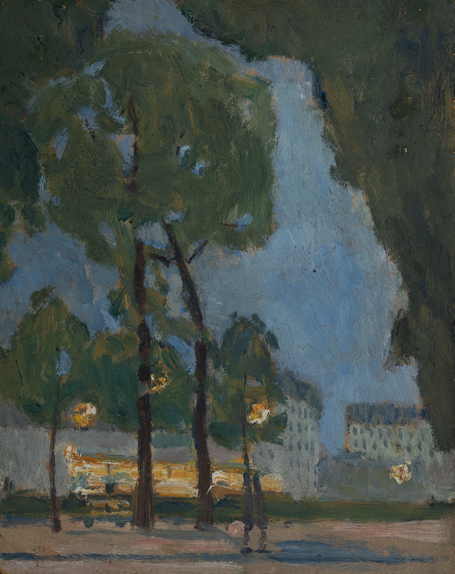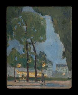 French School, Paris Nocturne Park scene with figures verso (double sided work). Unsigned. Oil on Board 24x19cm PROVENANCE: A private collection, Sydney.Estimate $80-150