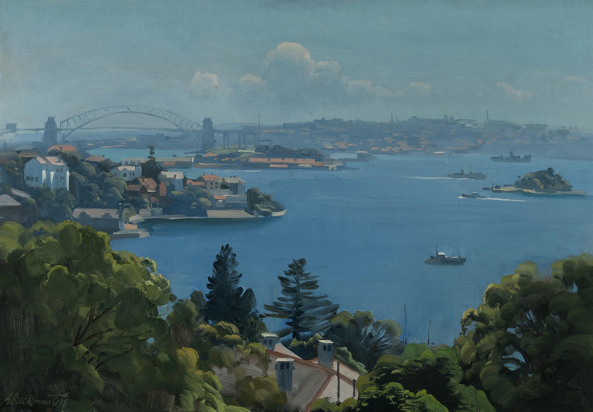 BUCKMASTER, Ernest (1897-1968) 'Unclouded Skies (Sydney)' 1953. Titled and dated verso, with additional signature. Oil on Canvas 52x75cmEstimate $6,000-9,000