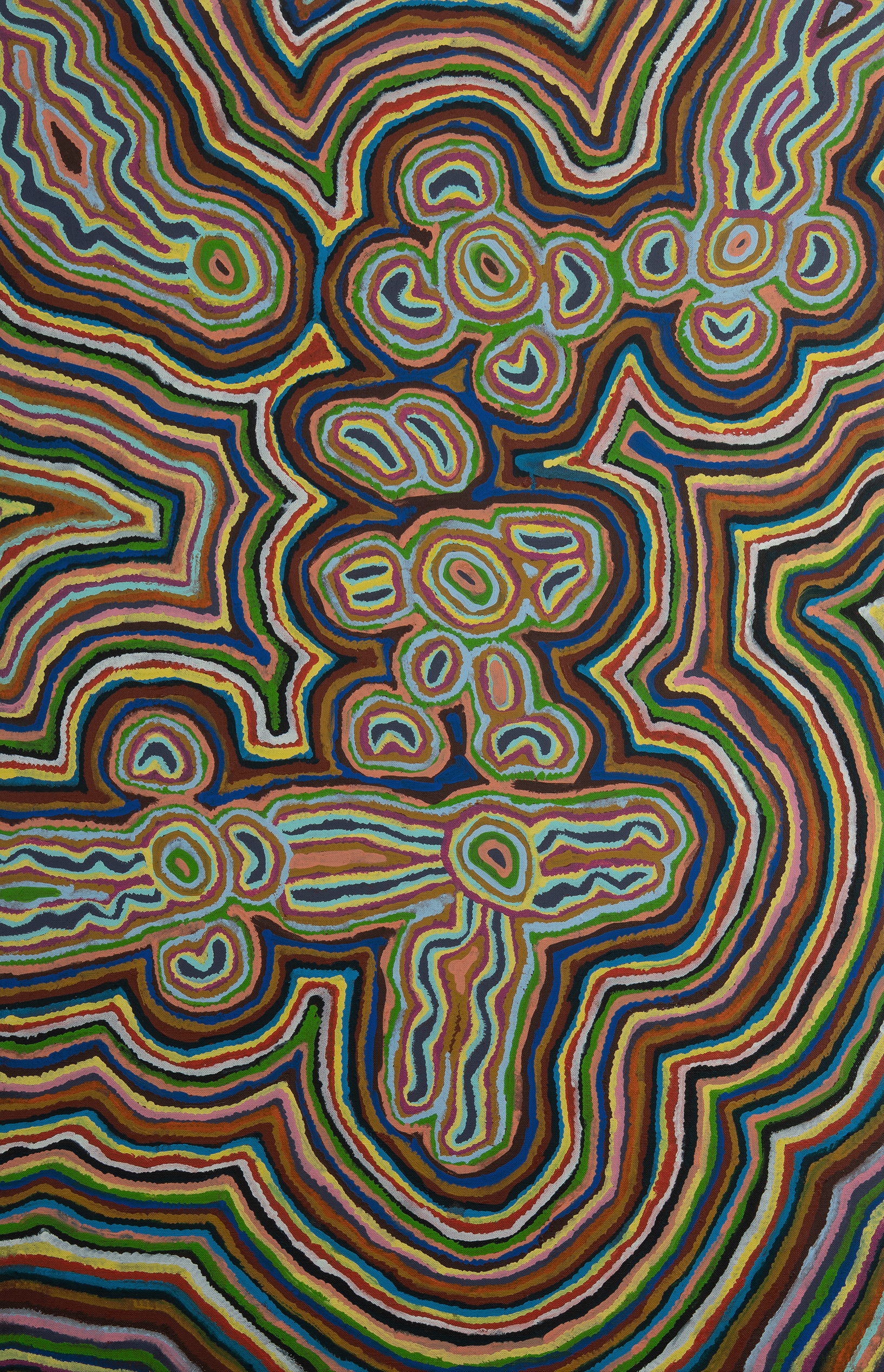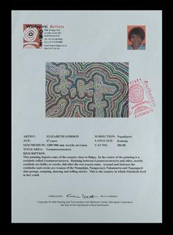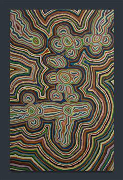 NAPALJARRI, Elizabeth Gordon (Aboriginal b.1954) 'Goonawarrawarra,' 2000. The work depicts the country close to Balgo, rockholes and creeks are full after wet season rains. Women are camping, dancing and telling stories. Acrylic on Linen 116x74.5cm PROVENANCE: Warlayirti Artists, cat #386/00 - certificate of authenticity available.Estimate $800-1,500