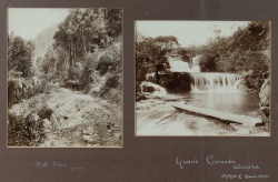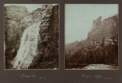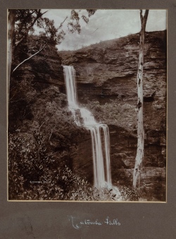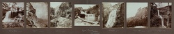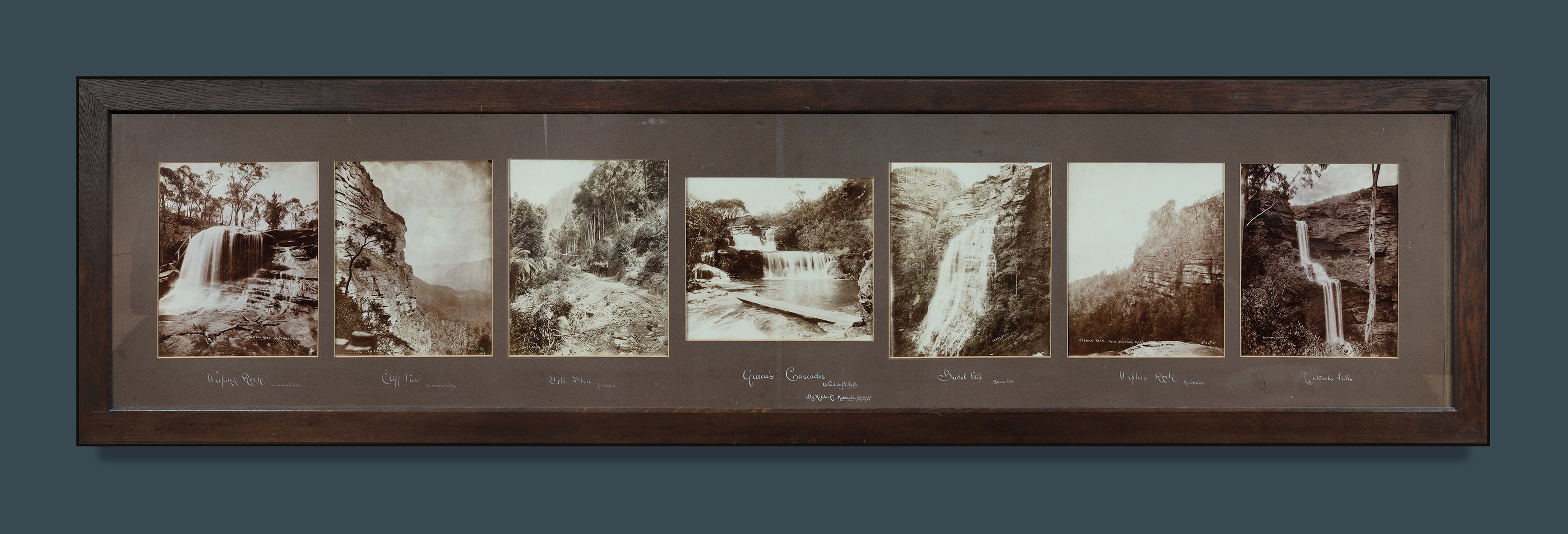 Blue Mountains Views. Seven original c.1910 natural beauty photographs by Katoomba photographer George Kitch of Kitch and Co. Photographs are titled in the negative and also in white script on the original mount, presented in the original hardwood frame. Views are Weeping Rock; Cliff View Jamison Valley; Dots Glen Castle Rock; Queens Cascades; Bridal Veil; Katoomba Falls. 28x24cm (each photo) 56x216cm (frame) (Rm8) Estimate $800-1,500