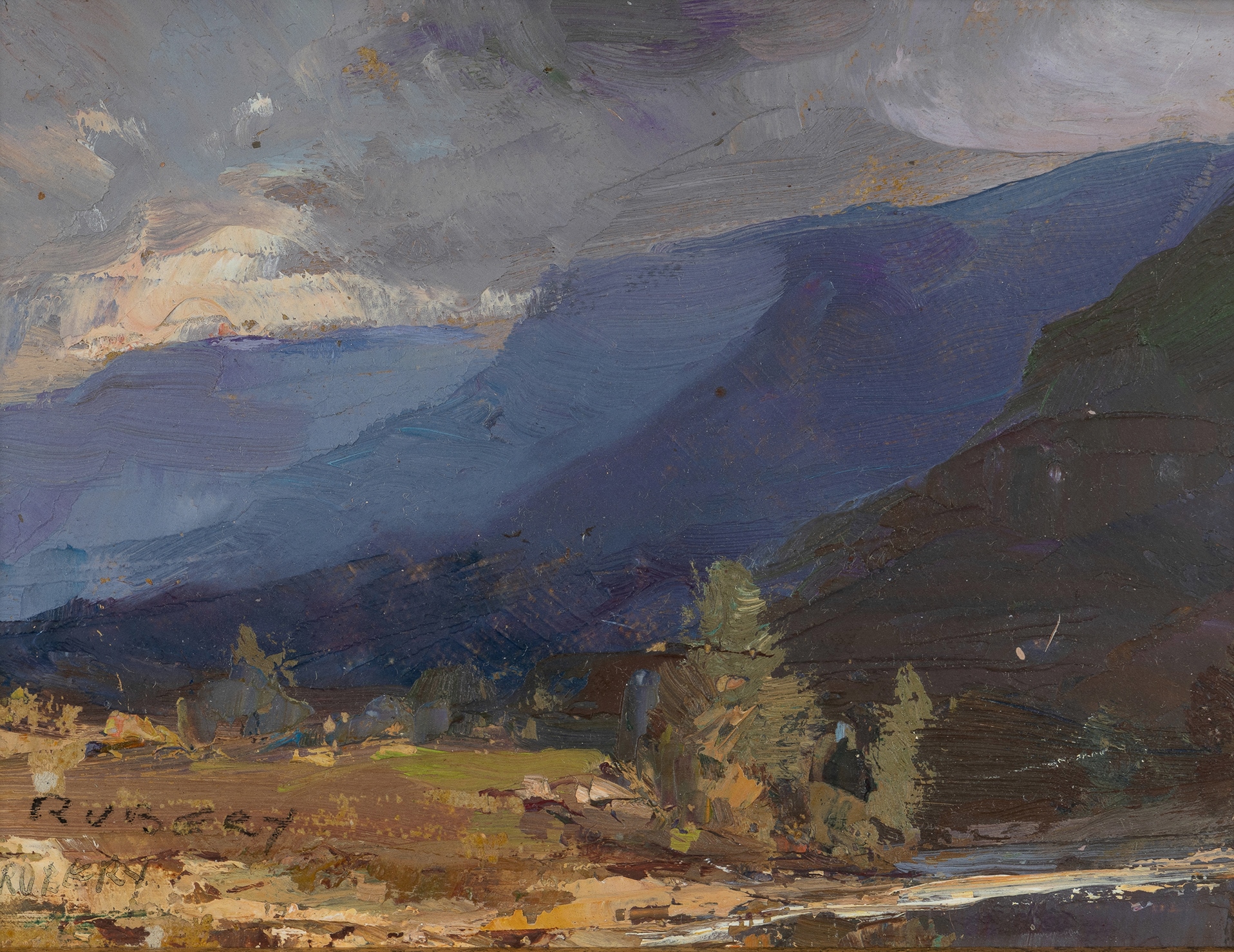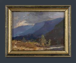 BENNETT, W Rubery (1893-1987) 'Burragorang Valley,' 1960s. Signed twice 'Rubery.' Oil on Board 9.5x13cm PROVENANCE: 8x6 exhibition of paintings by Rubery Bennett, Copperfield Gallery at the Hilton Hotel, Sydney, June 1979.Estimate $500-700