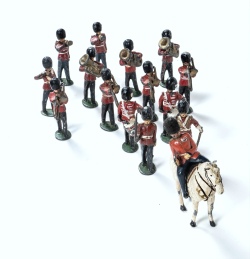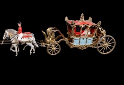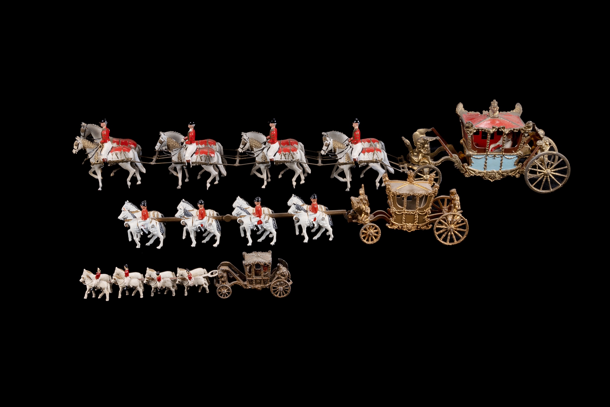 3 Various Queen Elizabeth II Coronation Coaches. Includes large Britains coach with 8 horses, some mounted; crescent set; other, of unknown origin. Also 15 guardsman lead figures, some losses to paint and parts. L51cm (Britains coach) (2B) Estimate $150-300
