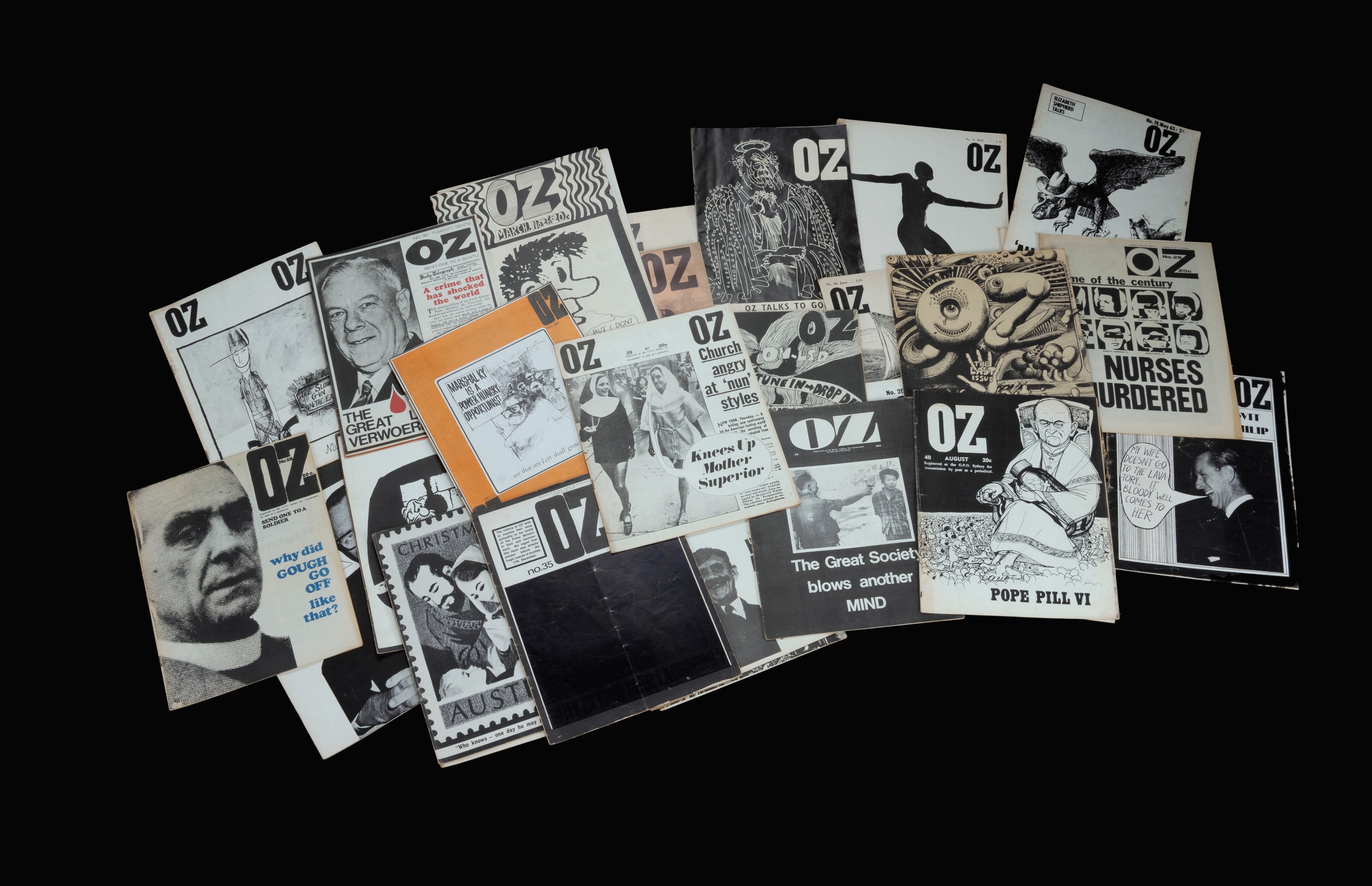OZ Magazine, Neville, Walsh, Sharp and Shead. Near complete run of this Sydney-centric iconic satirical publication, full of cheeky, revealing articles and the irreverent pop artwork of Martin SHARP and Garry SHEAD. Includes the famous cover of the editorial team 'urinating' in the Tom Bass fountain. Missing nos. 1, 5 and special 1969 election issue. 39 issues, most in fair to good condition, no.11 has very poor back cover. (Rm4) Estimate $900-1,500