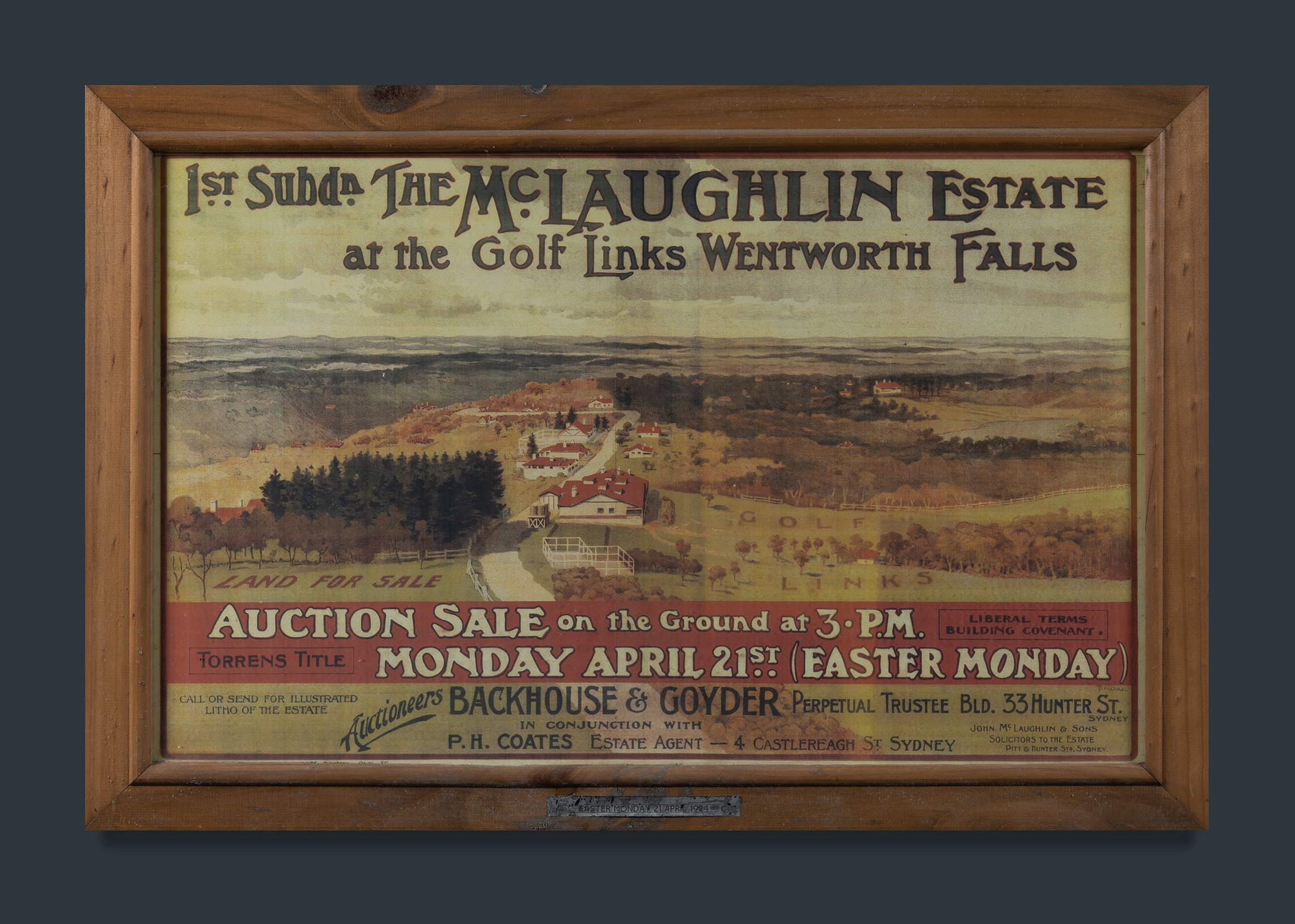 Wentworth Falls McLaughlin Estate Land Sale Poster. Reproduction poster from the original 1924 sale. Depicts Golf Links and plateau view. (36x58cm) (Rm4)Estimate $60-100