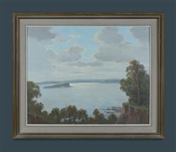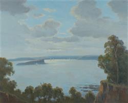 LANGKER, Erik (1898-1982) 'Into the Light, Broken Bay [NSW]' Artist label verso, with additional hand-written letter from the artist. Oil on Board 60x75cmEstimate $400-700