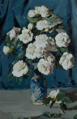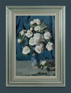 BAKER, Alan Douglas (1914-1987) Still Life with White Roses in Blue and White Vase Oil on Board 64.5x42.5cmEstimate $1,200-2,500