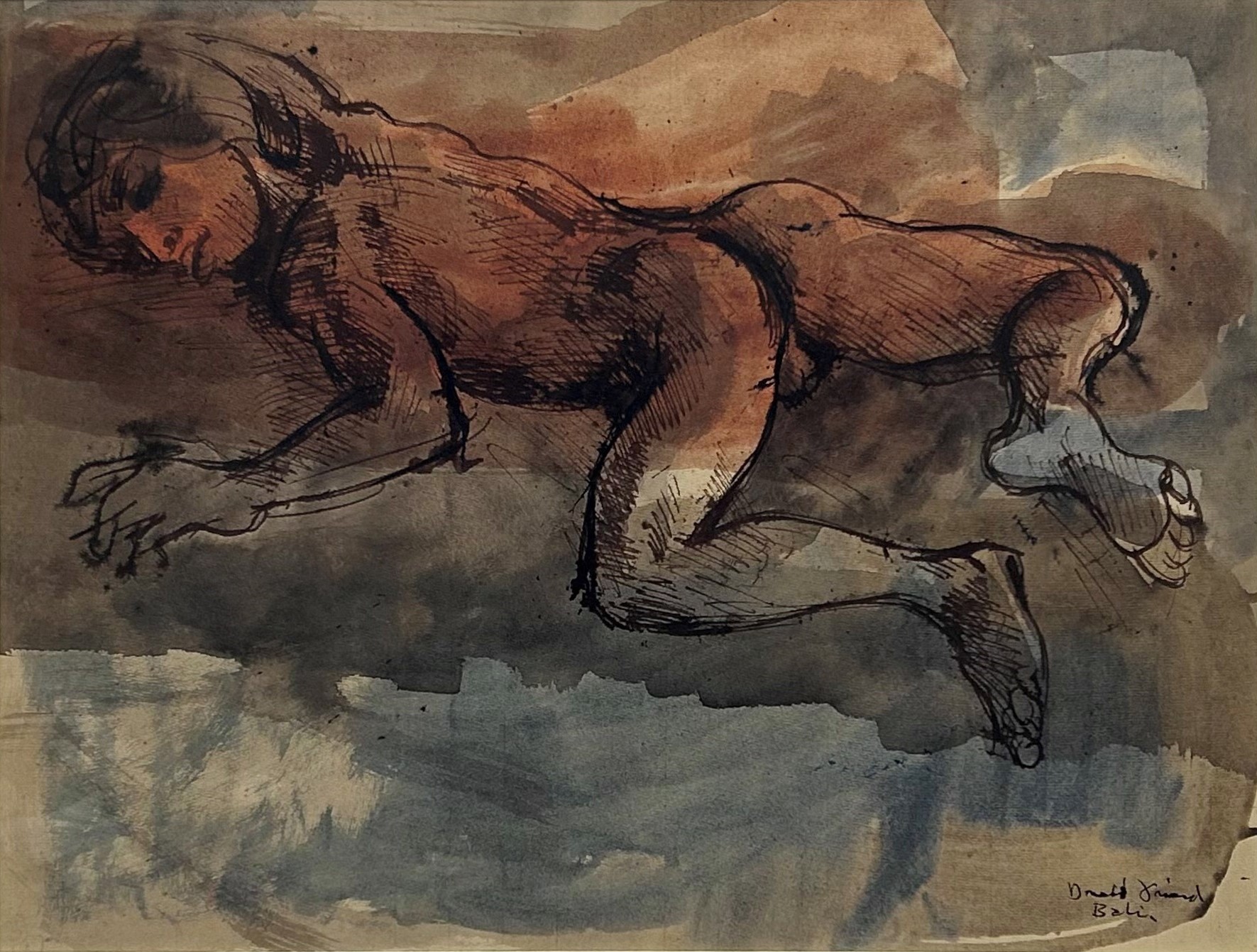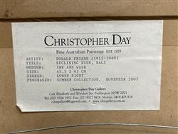 FRIEND, Donald (1915-1989) 'Reclining Nude, Bali' Signed & inscribed lower right. Ink & W/Clr 45.5x61cm 82x94cm (framed) PROVENANCE: Christopher Day Gallery, Paddington NSW 'Summer Collection,' November 2007 (label verso)Estimate $800-1,500