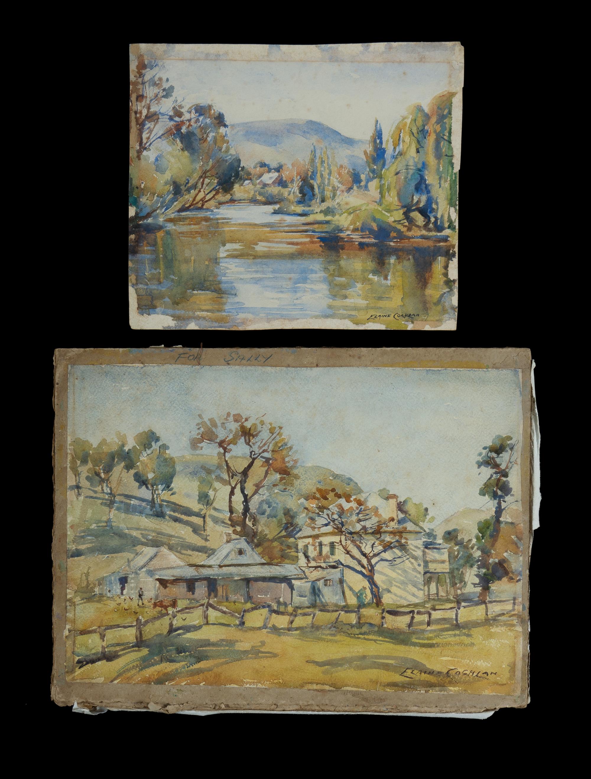 COGHLAN, Elaine (1897-1989) (2) 'Brookside, Picton, N.S.W,' with original artist's label verso (28x39cm); & 'Tumut, N.S.W.' (24.5x28cm) W/Clr (2) PROVENANCE: Belinda Foy, great niece of the artist.Estimate $150-250