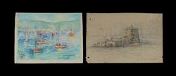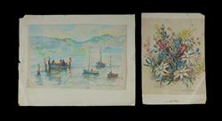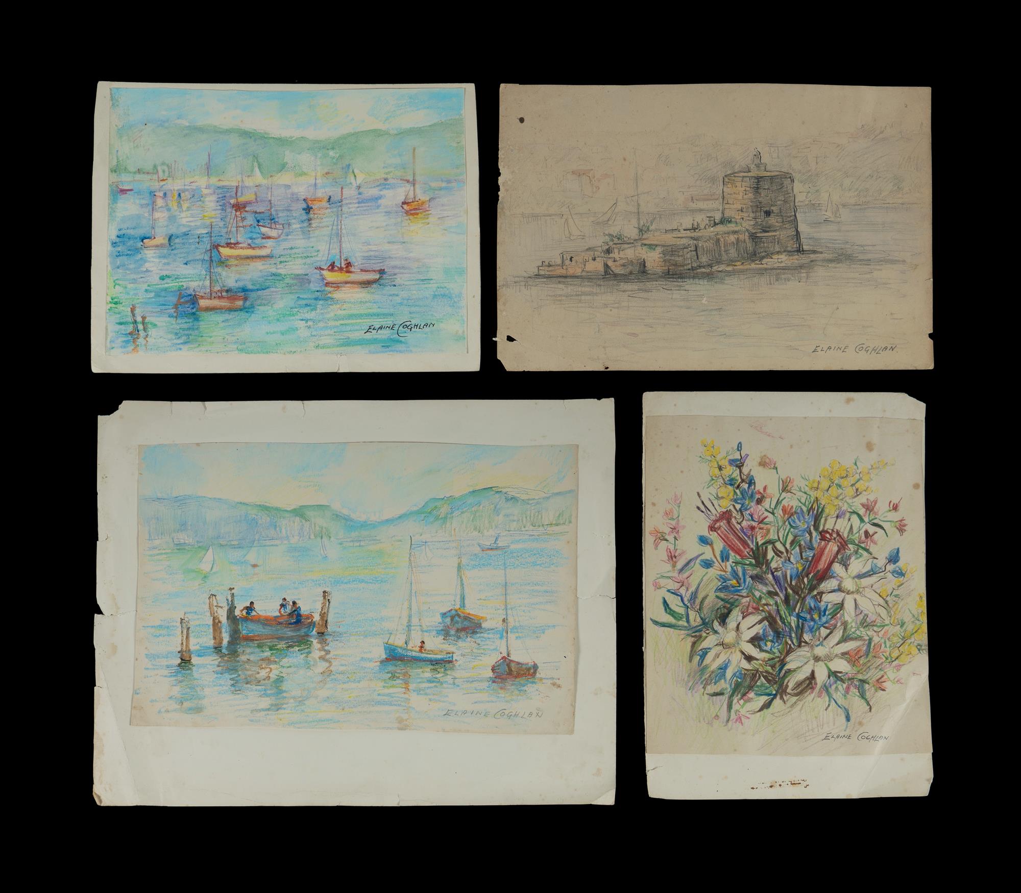 COGHLAN, Elaine (1897-1989) (4) Two Crayon Views of Boats in a Harbour (18x27cm, & 16x22cm); Australian Wildflowers, coloured pencils (21x17.5cm); & pencil sketch of Fort Denison (17.5x27cm) PROVENANCE: Belinda Foy, great niece of the artist.Estimate $150-250
