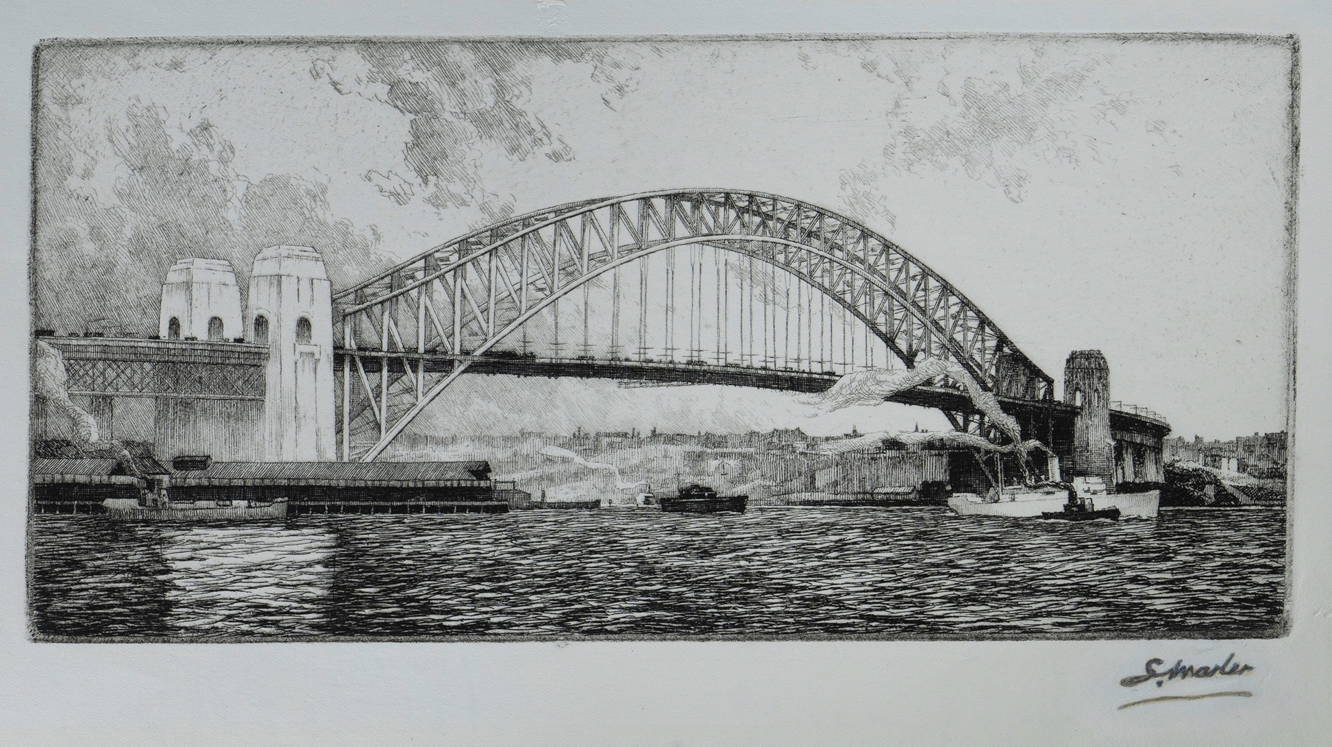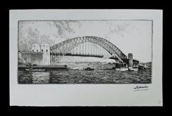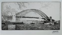 WARNER, A E (1879-1968) Sydney Harbour Bridge Signed indistinctly 'G Marler' a known pseudonym of the artist. Etching 11x23.5cm PROVENANCE: Seeing Sydney Harbour, Collection of Jim Haynes OAM and Robyn McMillan.Estimate $100-200