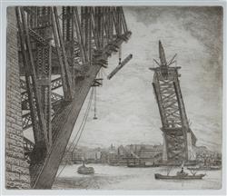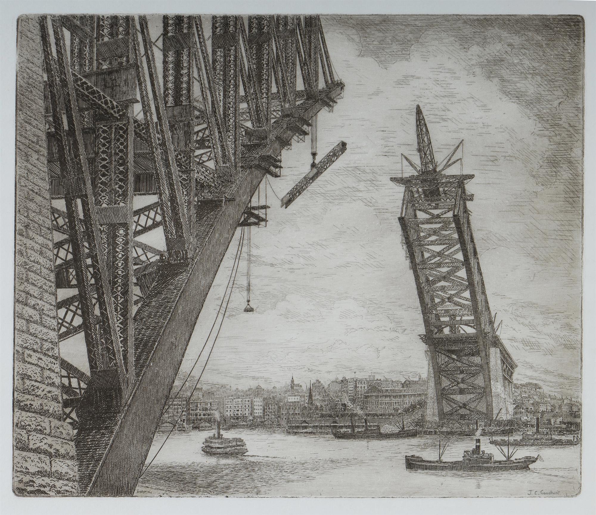 GOODHART, Joseph C (1875-1952) 'Building the Bridge,' 1930. Etching 27.5x33cm PROVENANCE: Seeing Sydney Harbour, Collection of Jim Haynes OAM and Robyn McMillan.Estimate $200-400