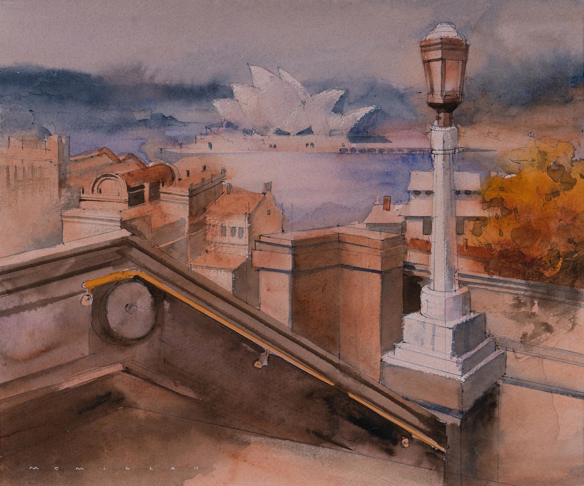 McMILLAN, Alex (1910-1987) 'From Quay West' Artist's label verso. W/Clr & Gouache 24x28.5cm PROVENANCE: Seeing Sydney Harbour, Collection of Jim Haynes OAM and Robyn McMillan.Estimate $150-250