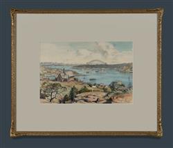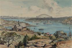 PRATT, Douglas (1900-1972) Sydney Harbour Bridge - viewed from near St Peter's Anglican Church, Watsons Bay W/Clr 23.5x35cm PROVENANCE: Seeing Sydney Harbour, Collection of Jim Haynes OAM and Robyn McMillan.Estimate $400-700