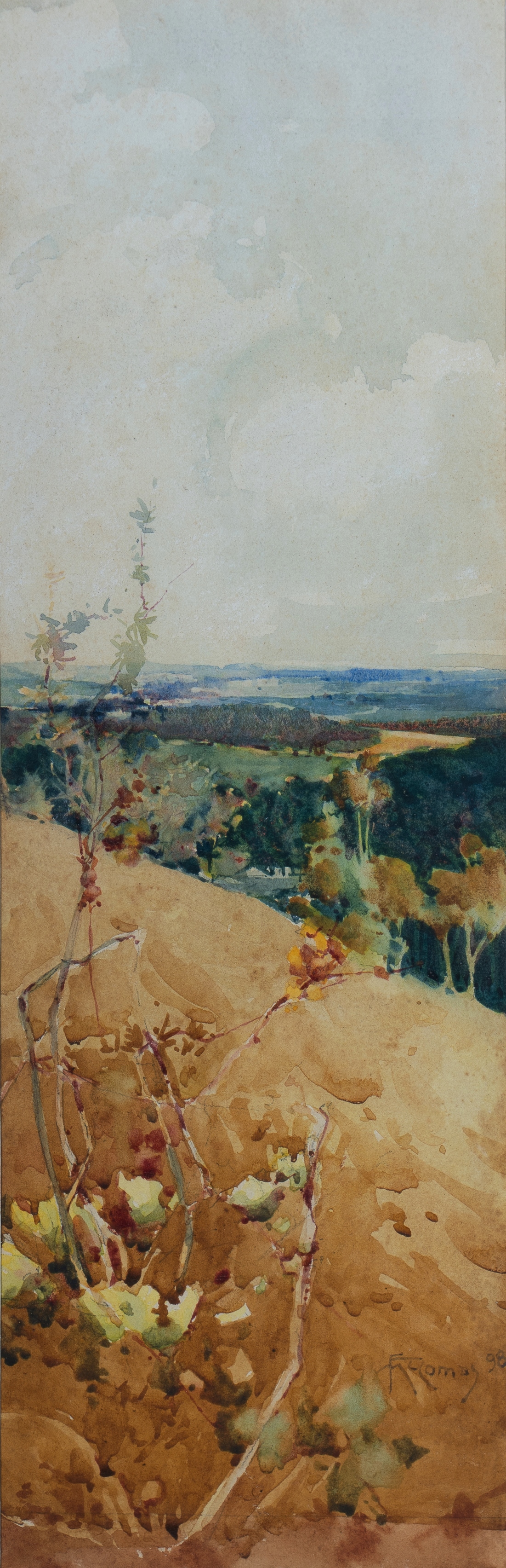 McCOMAS, Francis (1874-1938) 'Hawkesbury Landscape,' 1898. W/Clr 38.5x12.5cm PROVENANCE: Mrs John Young (John Young was the founder of Macquarie Galleries, Sydney); thence by descent - private collection, QLD. EXHIBITIONS: National Art Gallery of N.S.W 'All Australian Art Exhibition,' Jan - Apr 1938, possibly cat #378 (label verso).Estimate $1,500-3,000