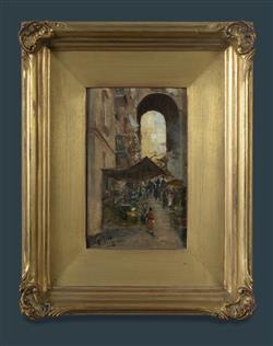 NERLI, Girolamo (1860-1926) Cairo Street Scene Label verso for James Makin Gallery, Melbourne. Oil on Canvas on Board 21.5x13.5cm PROVENANCE: Private collection, Victoria; Lawson-Menzies 19th May 2011 (lot 66); private collection, NSW.Estimate $3,000-5,000