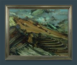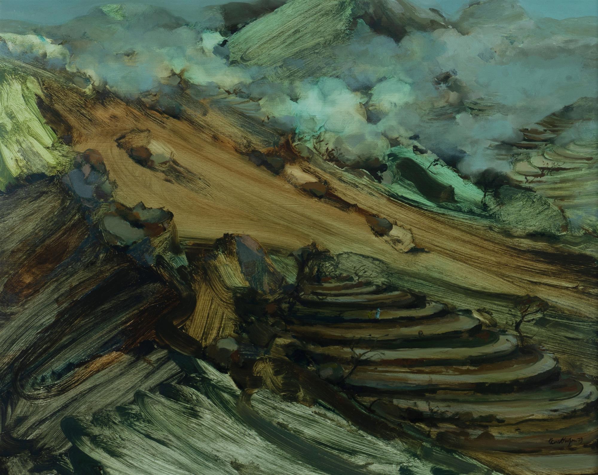 JOHNSON, Ken (b.1950) 'Gandrung Seclusion,' 1973. Mountain summit in Kediri Regency, East Java, Indonesia. Painted during the artist's Asian travels. Oil on Board 77x97cmEstimate $400-600