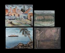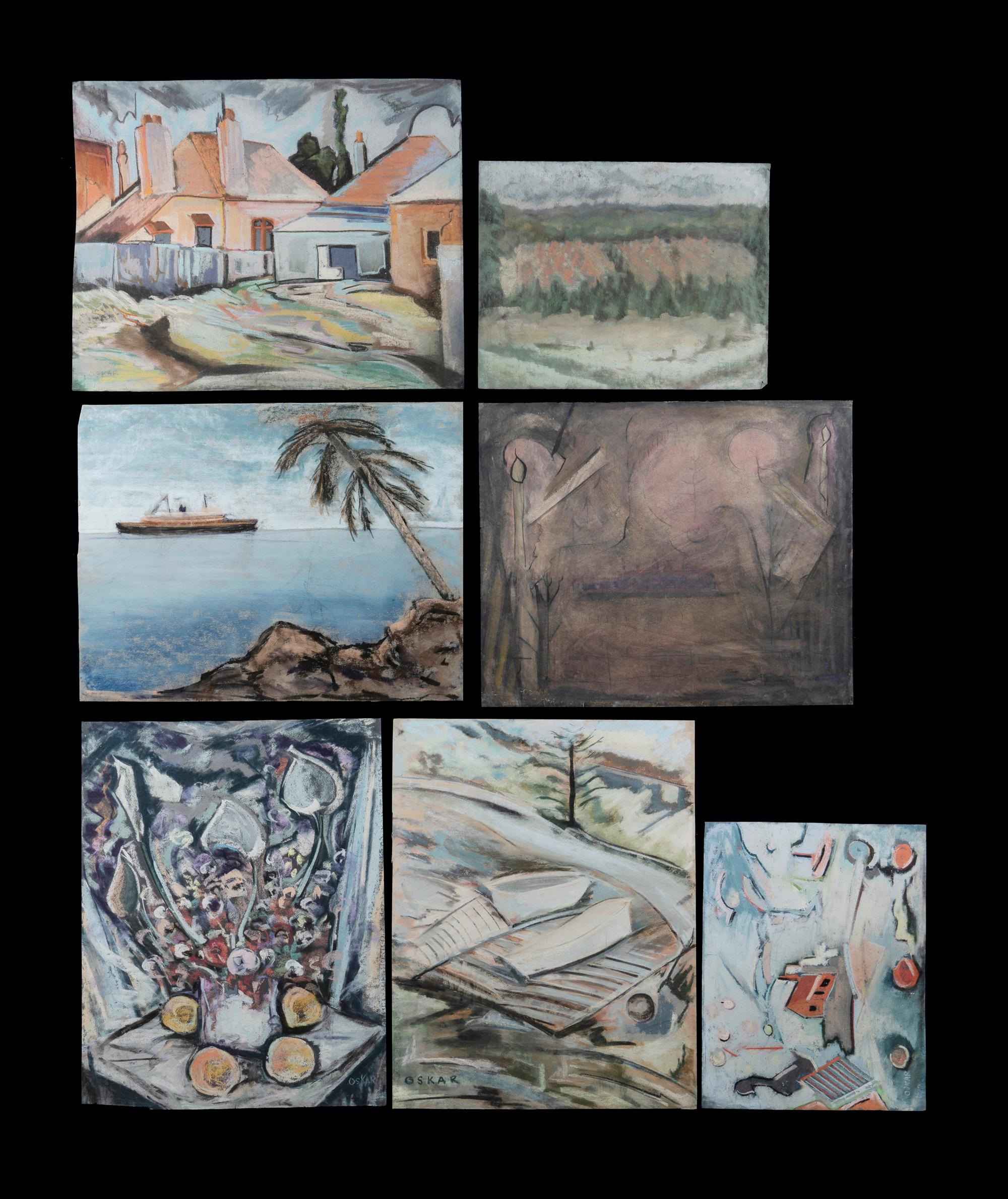 EDWARDS, Oscar (1905-1996) (17) Ship and Palm Tree (49.5x64.5cm); Ship Through Evening Haze (50.5x62cm); Boat Ramp (65x49.5cm); Still Life with Fruit & Flowers (64.5x49cm); House & Boat Abstract (37x48cm); Landscape (37x48cm); Landscape Abstract; Water Tank; Iron Foundry; Farm House; View to Distant Lake, unsigned; Rolling Fields and Telegraph Poles, unsigned; Bridge to Small Island; Still Life with Mixed Blooms; Rooftops, unsigned; Radiant Building, unsigned and Suburban Homes; Pastel (17) 50x65cm (11) each