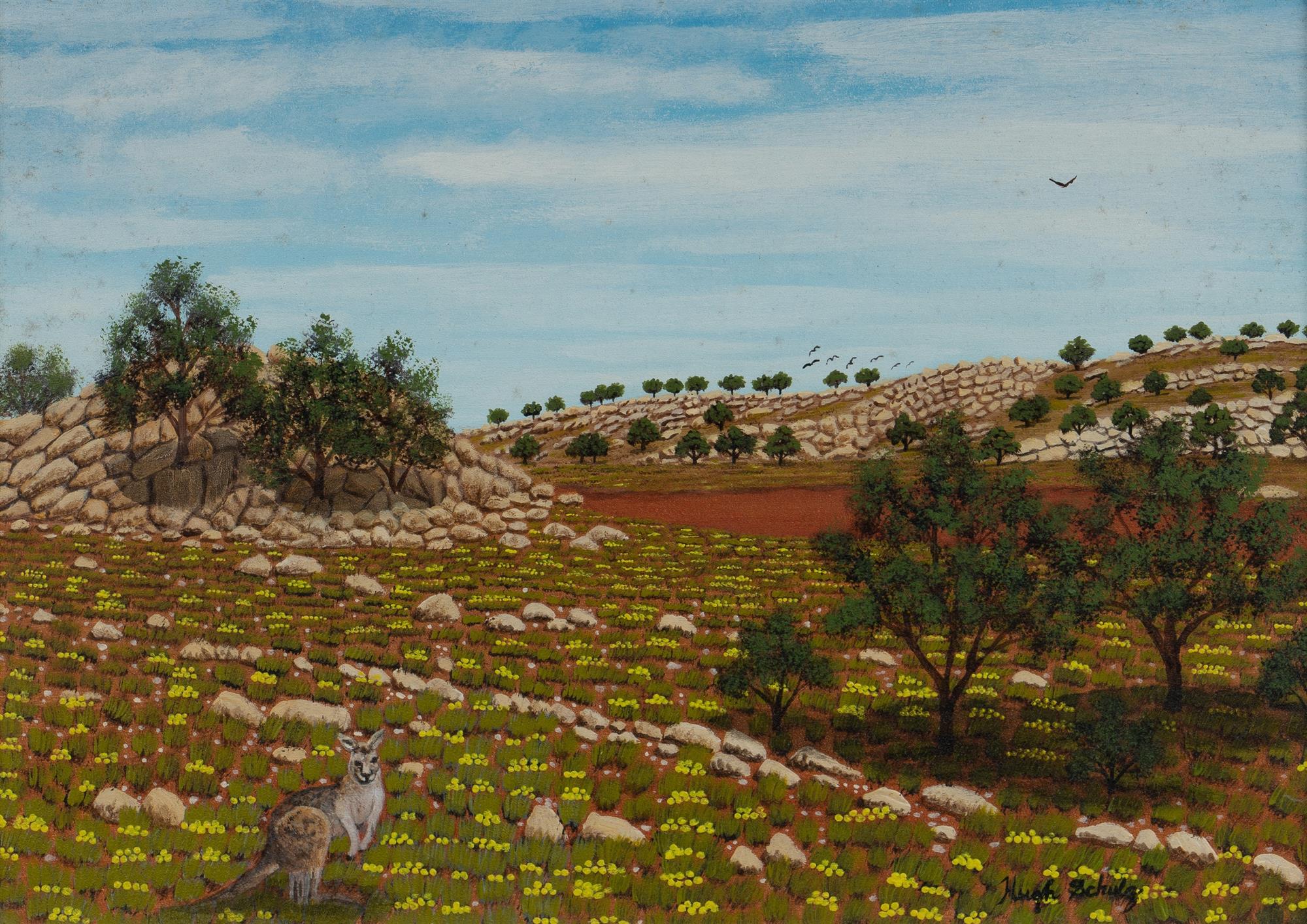 SCHULZ, Hugh (1921-2005) 'After Rain, Broken Hill' Brushmen of the Bush label verso. Acrylic on Board 24x34.5cm PROVENANCE: Private collection, Sydney.Estimate $500-800