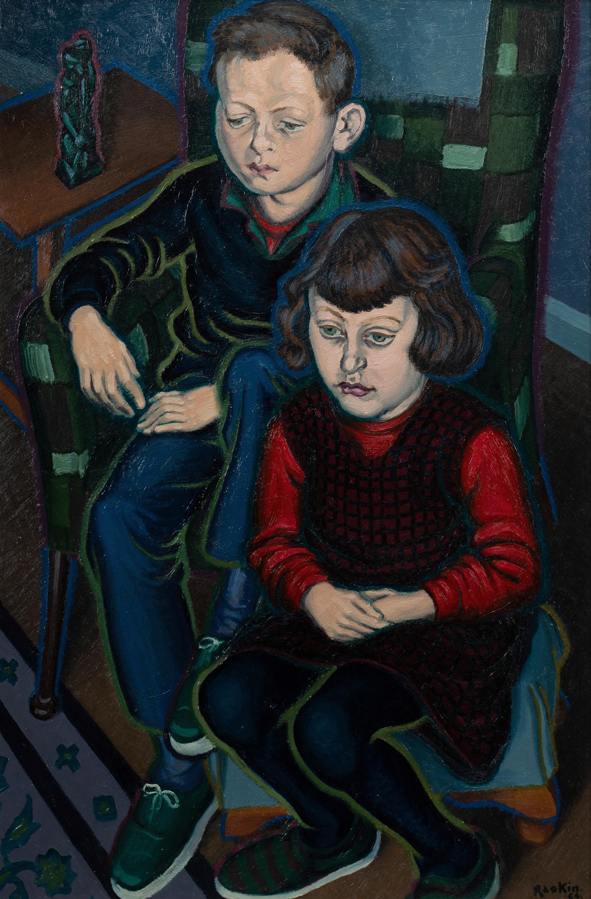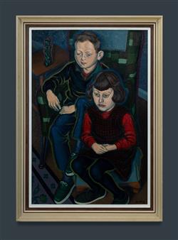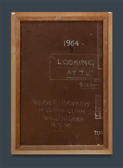HAWKINS, Harold Weaver (Raokin) (1893-1977) 'Looking at TV,' 1964. Signed Raokin lower right, inscribed with title verso. Oil on Board 90.5x60cmEstimate $8,000-12,000