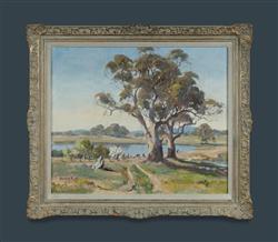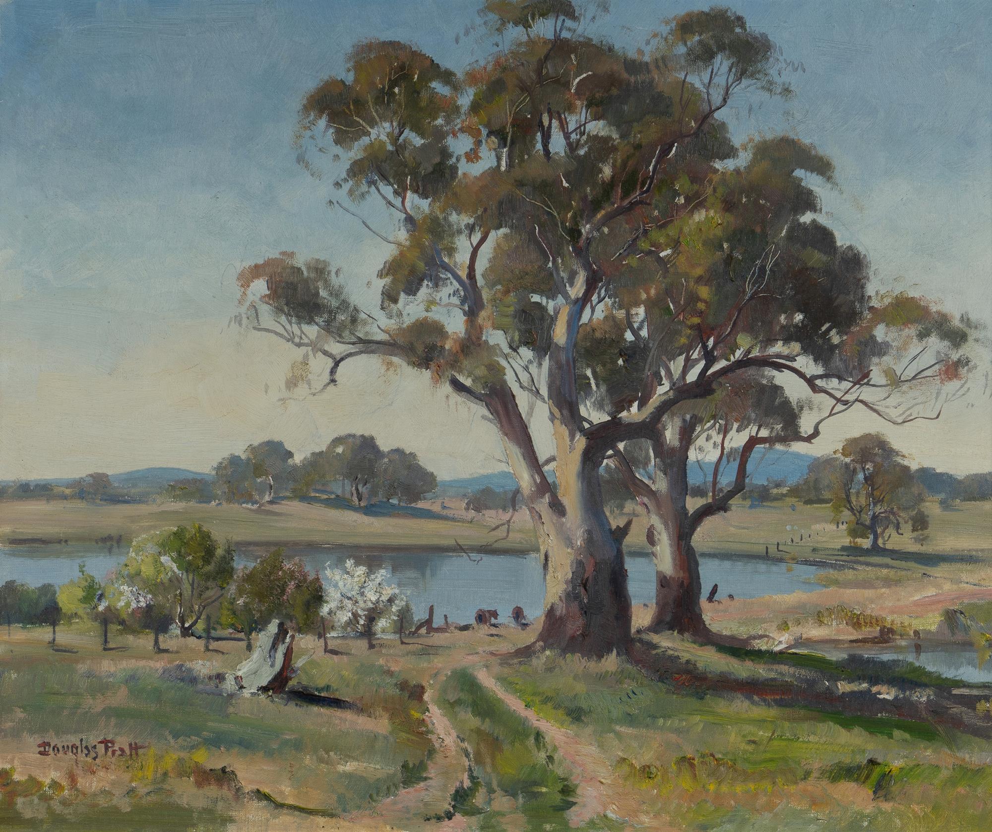 PRATT, Douglas (1900-1972) Country Property with Gum Trees and Orchard Oil on Canvas Board 49.5x59.5cmEstimate $300-500