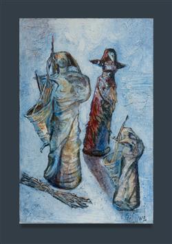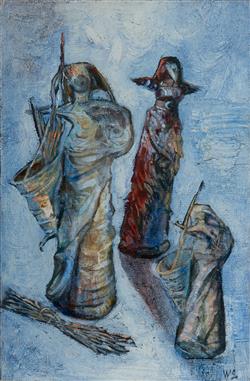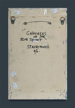 STAVRIANOS, Wendy (b.1941) 'Gatherers of the Blue Spirit,' 1996. Oil on Canvas 30.5x20cm PROVENANCE: Eva Breuer Gallery (purchased 2000)Estimate $150-300