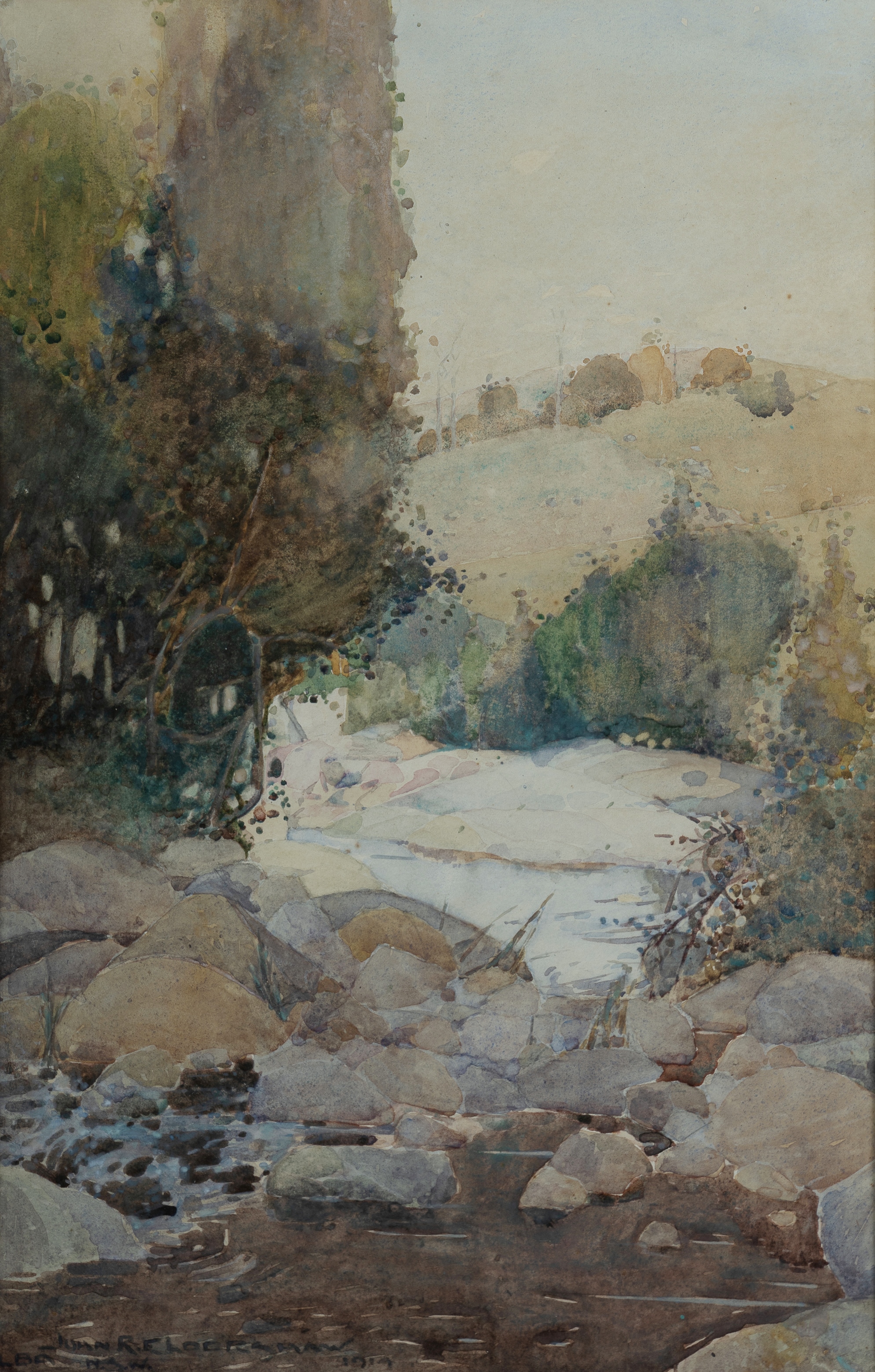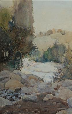 ELDERSHAW, J Roy (1892-1973) 'Singing Waters - Mountain Creek at Tilba Tilba, N.S.W.' Nov. 1914. These details inscribed verso. Also signed, dated and inscribed lower left. W/Clr 52x33.5cmEstimate $300-500