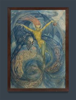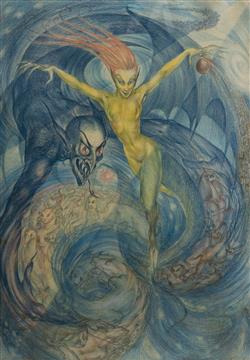 NORTON, Rosaleen (1917-1979) Witch's Vortex Unsigned Coloured Pencils 77.5x55cm PROVENANCE: Mrs Augusta Macdougall, proprietor Pakie's club, 219 Elizabeth St Sydney (gifted by the artist who frequented the club, a bohemian haunt of writers and artists); thence by descent - estate late Deidre Macdougall.Estimate $2,000-4,000