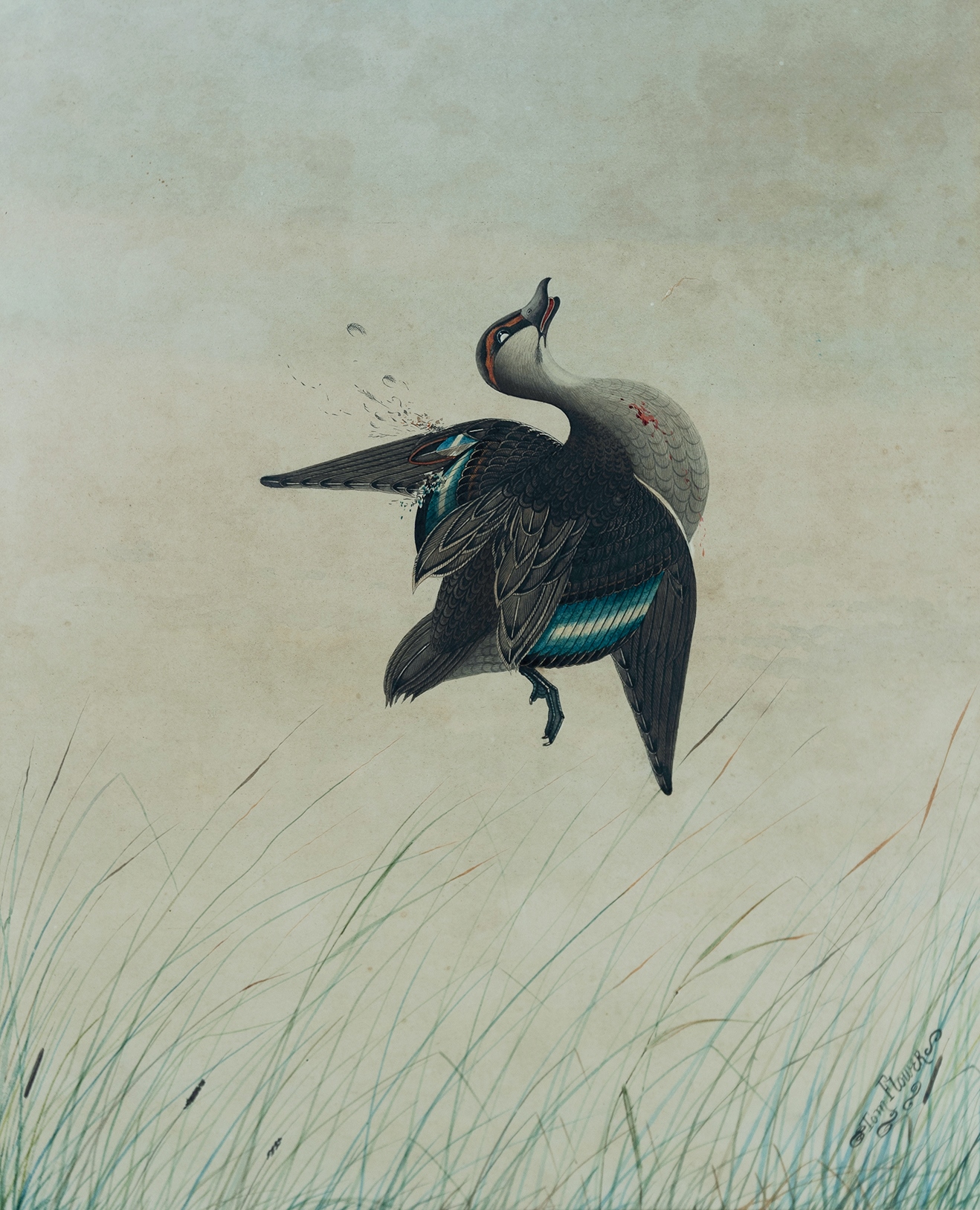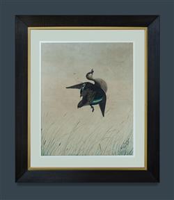 FLOWER, Tom Shot Pacific Black Duck in Flight 'Tom Flower' is considered by many to be a pseudonym for Neville H Cayley (1853-1903). W/Clr 61.5x50cmEstimate $200-400